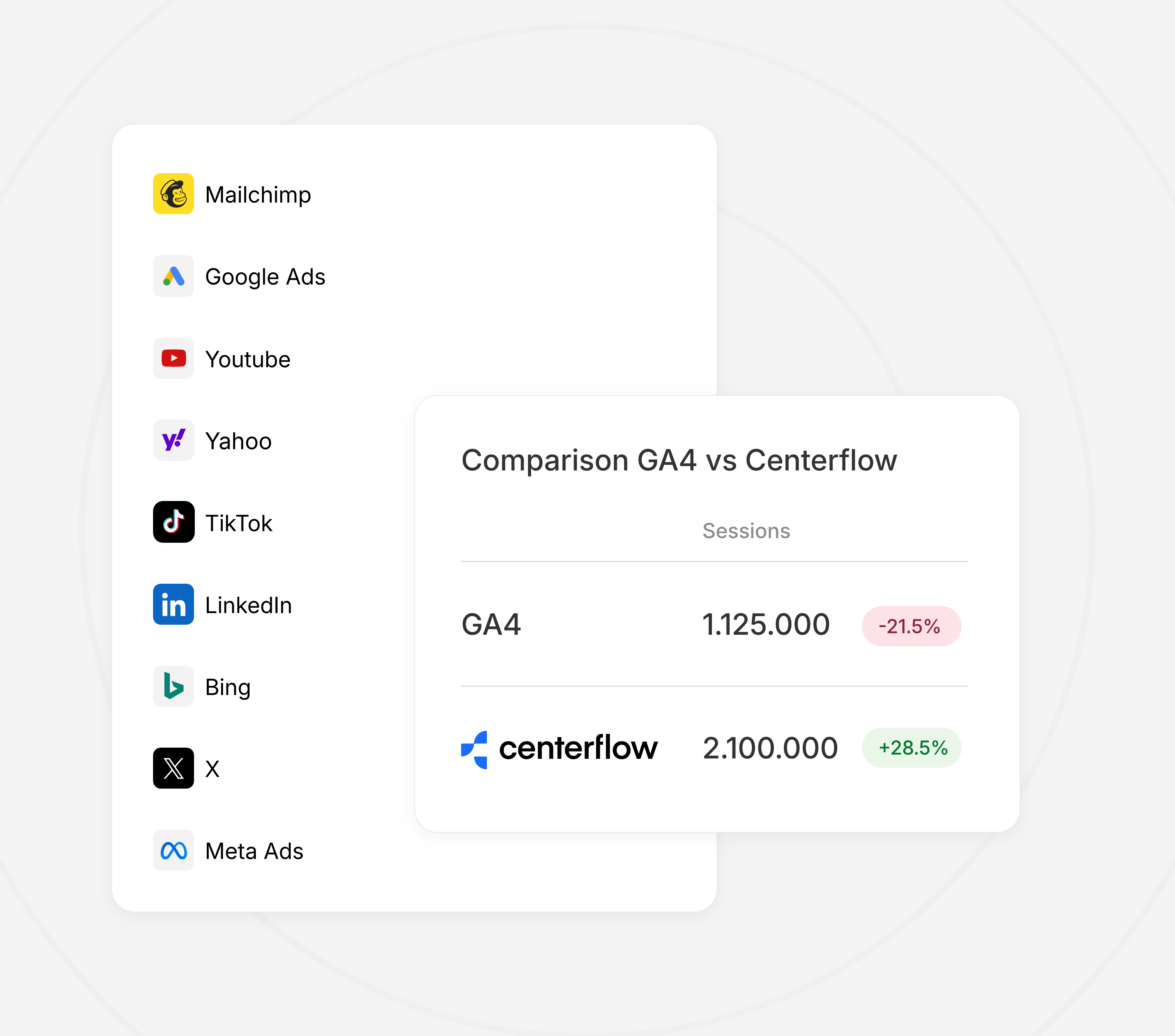 Centerflow works with any UTM-tagged traffic and all major ad platforms you integrate with: Google Ads, Meta Ads, LinkedIn Ads, TikTok Ads, Microsoft Ads. Plus email marketing, organic search, referrals and direct traffic. Everything measured together in one place.
